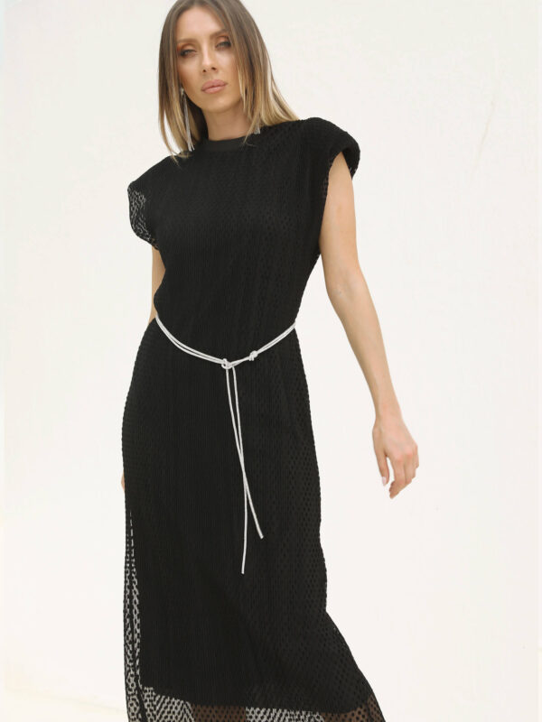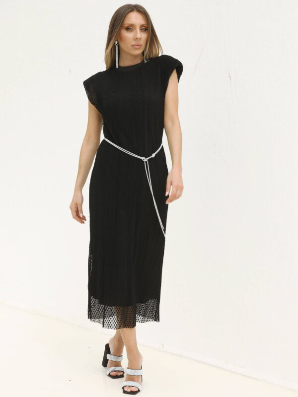 Siyah Taş Kemerli Puantiye Şifon Elbise