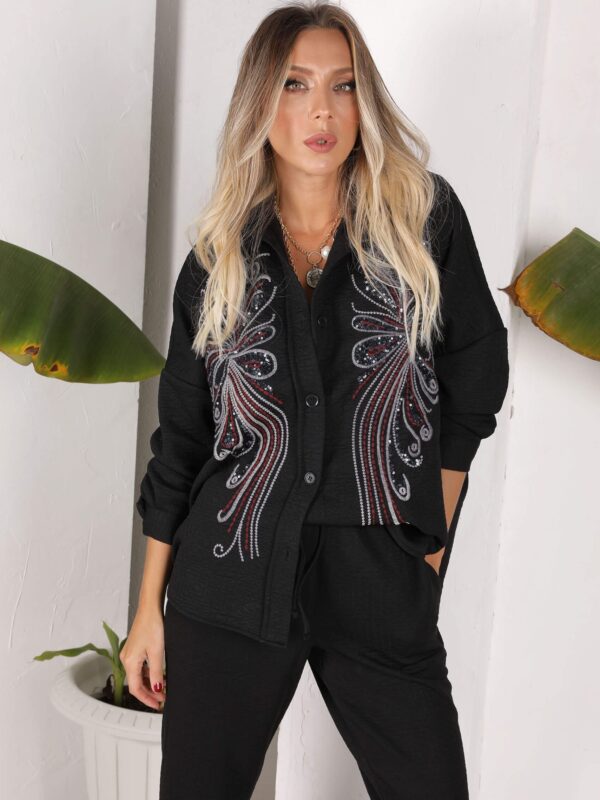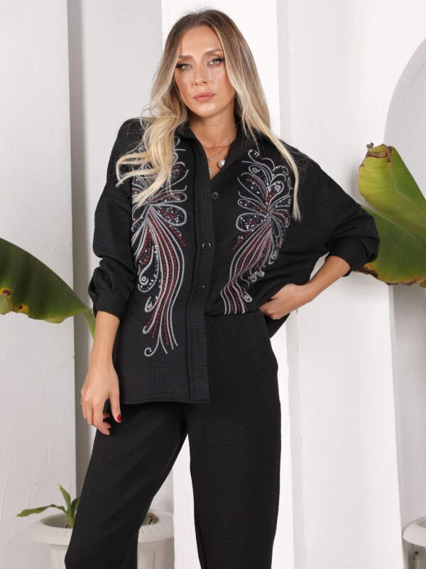 Siyah Yan Gümüş İşleme Çelik Krep Pantolon