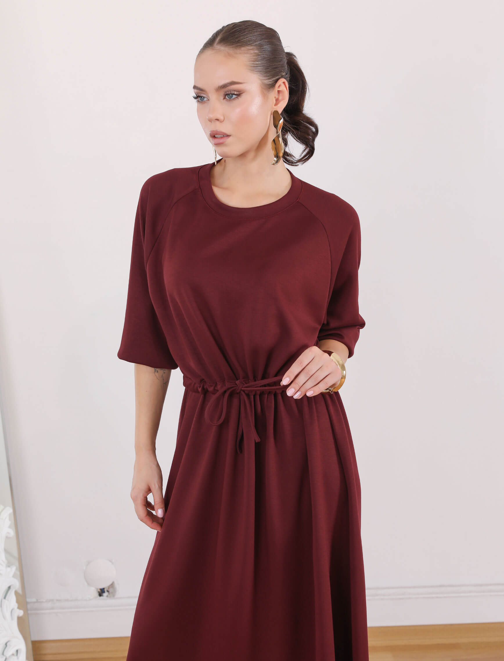 Bordo Bel Büzgülü Tina Elbise