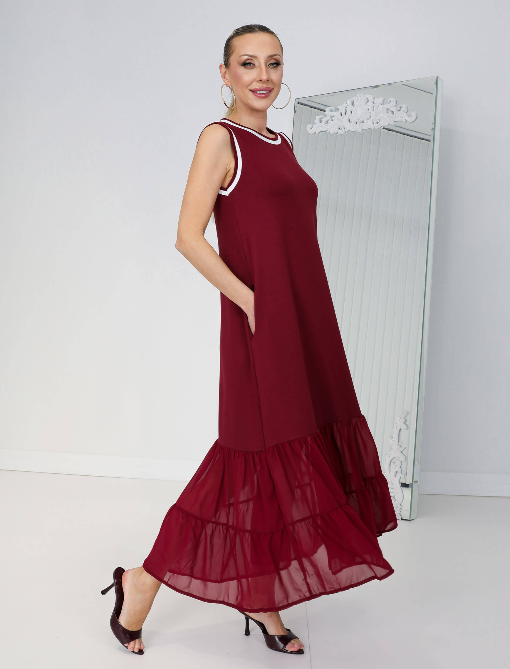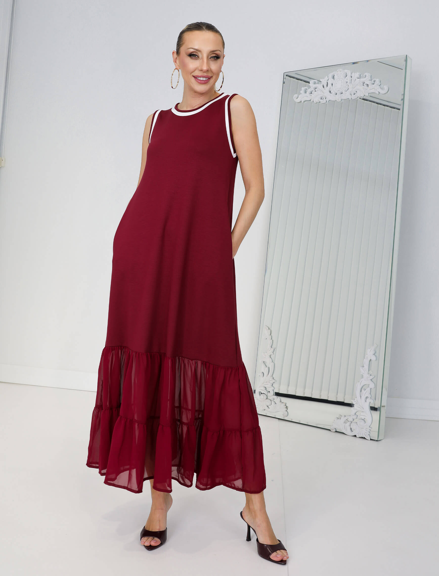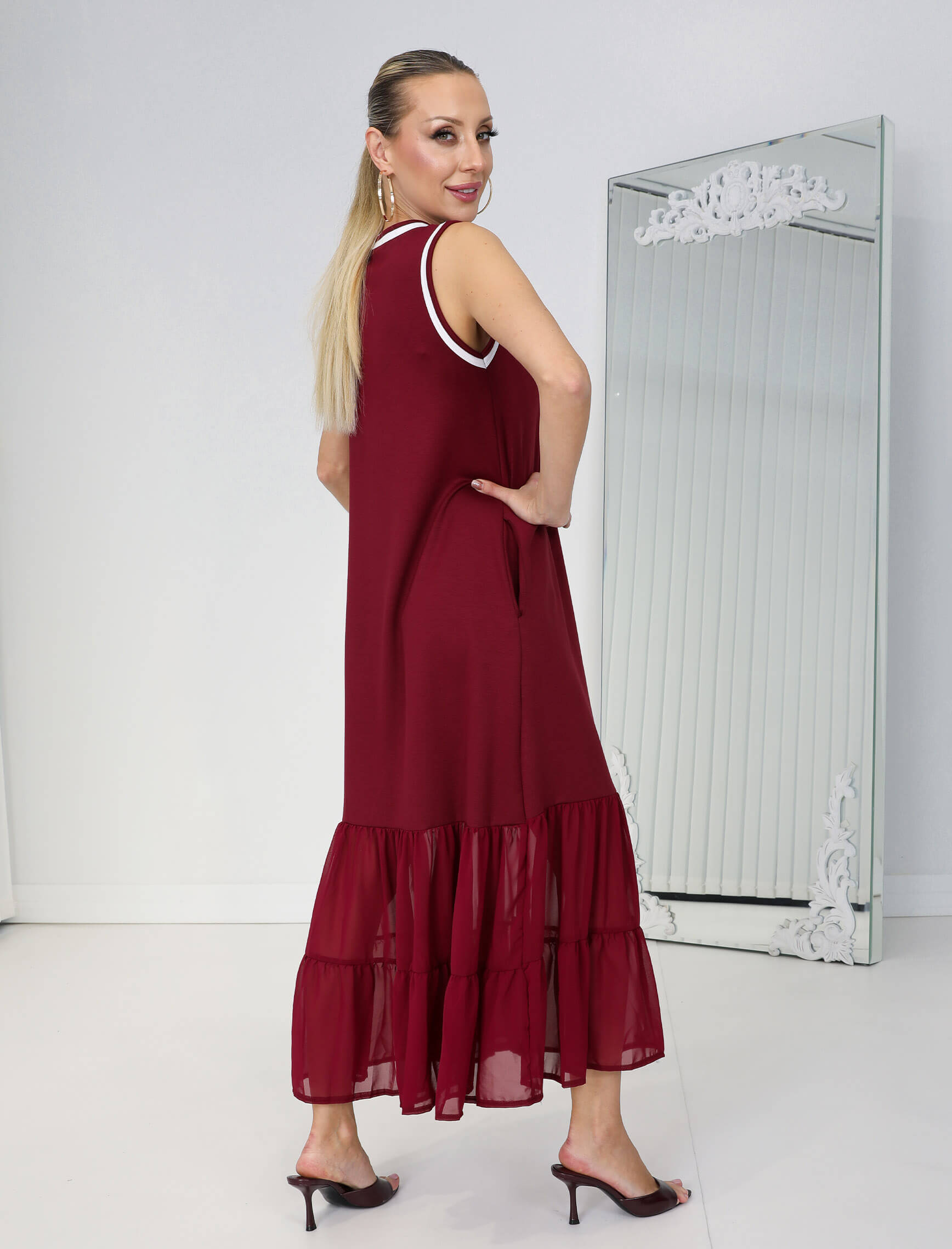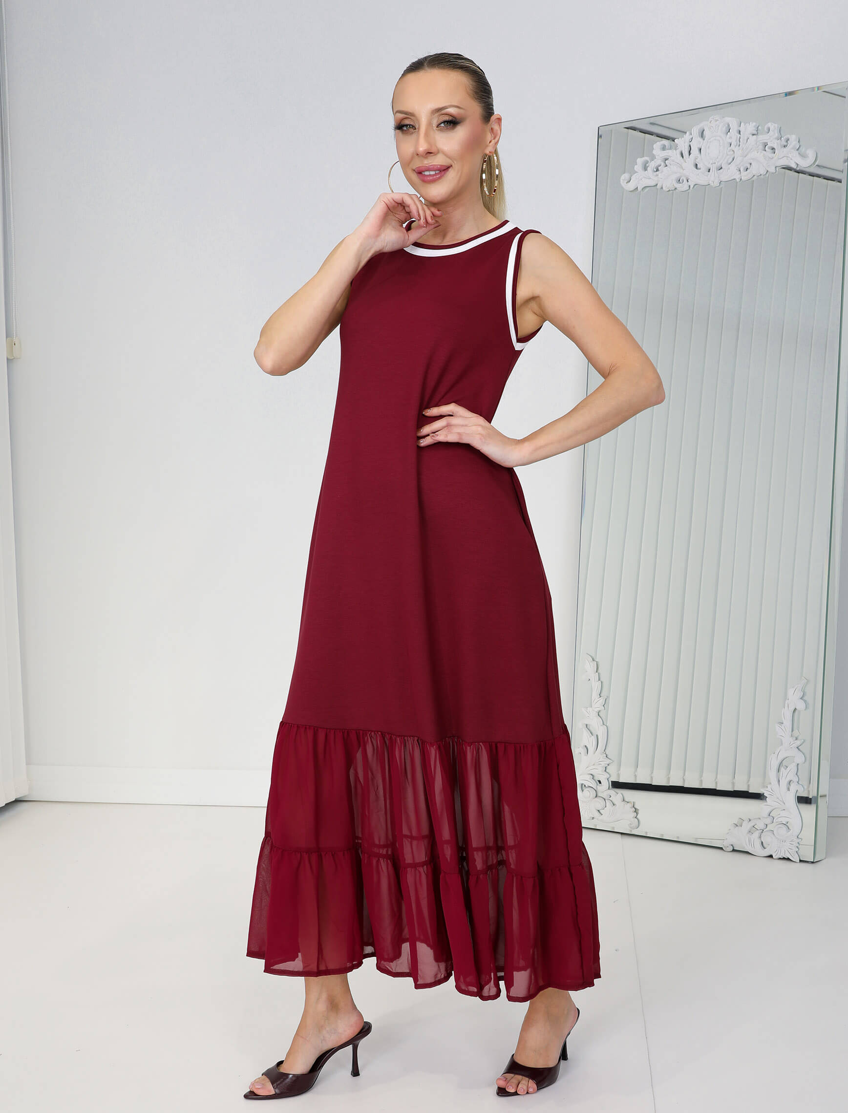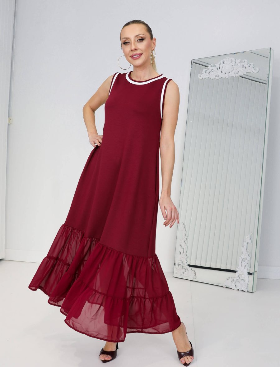 Bordo Beyaz Biye Şifon Etek Elbise