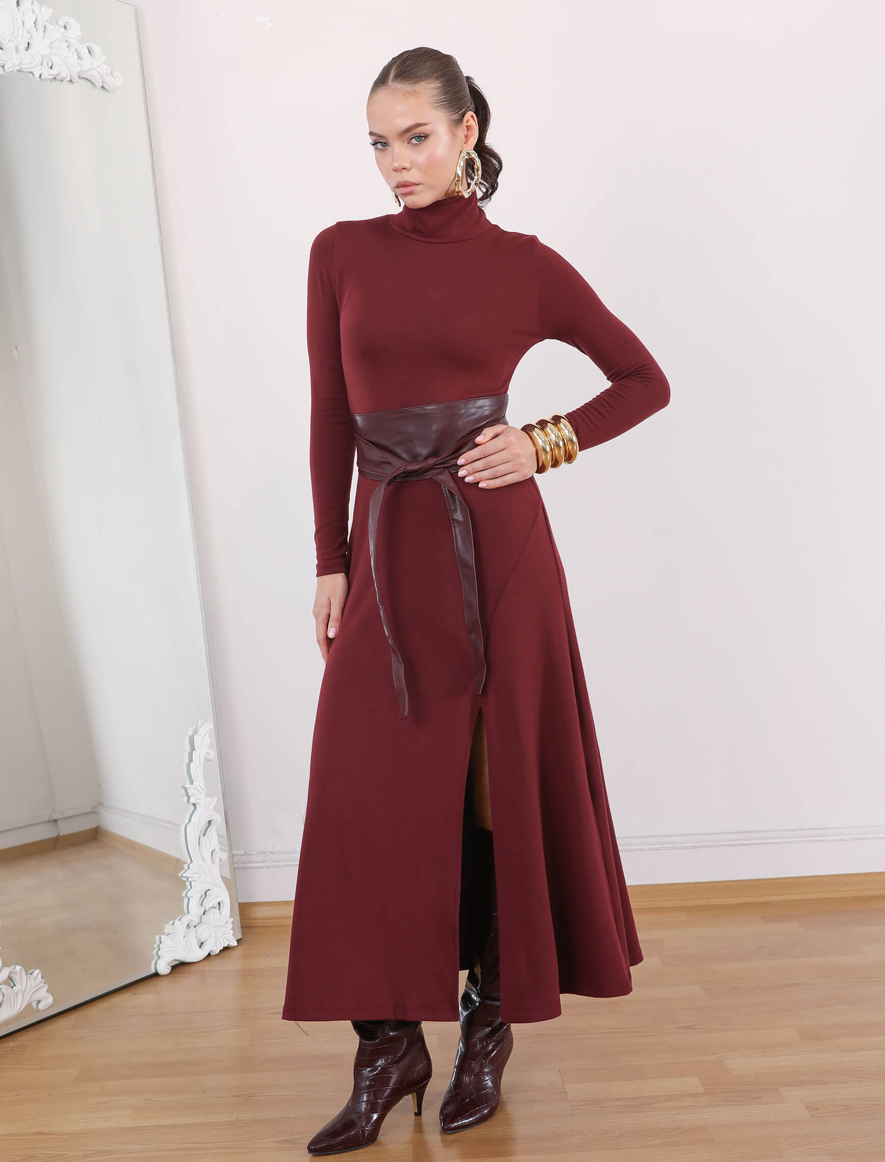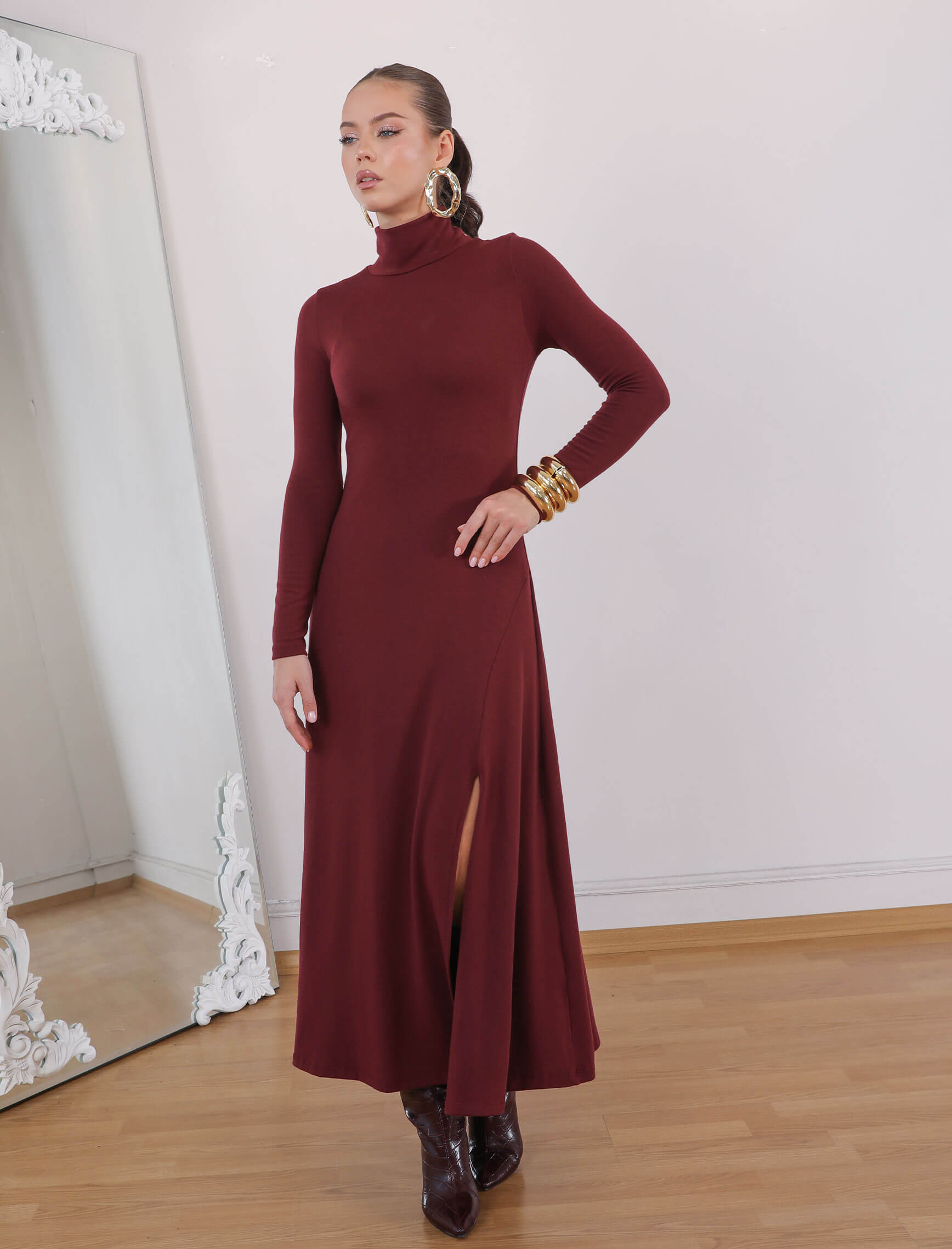 Bordo Boğazlı Yan Yırtmaç Elbise