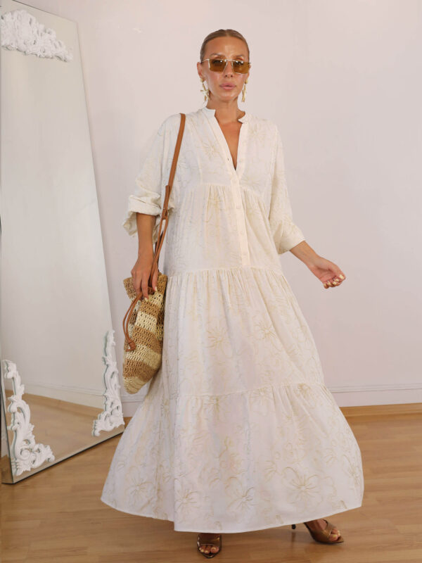 Gold Çiçek Nakış Ekru Katelya Elbise