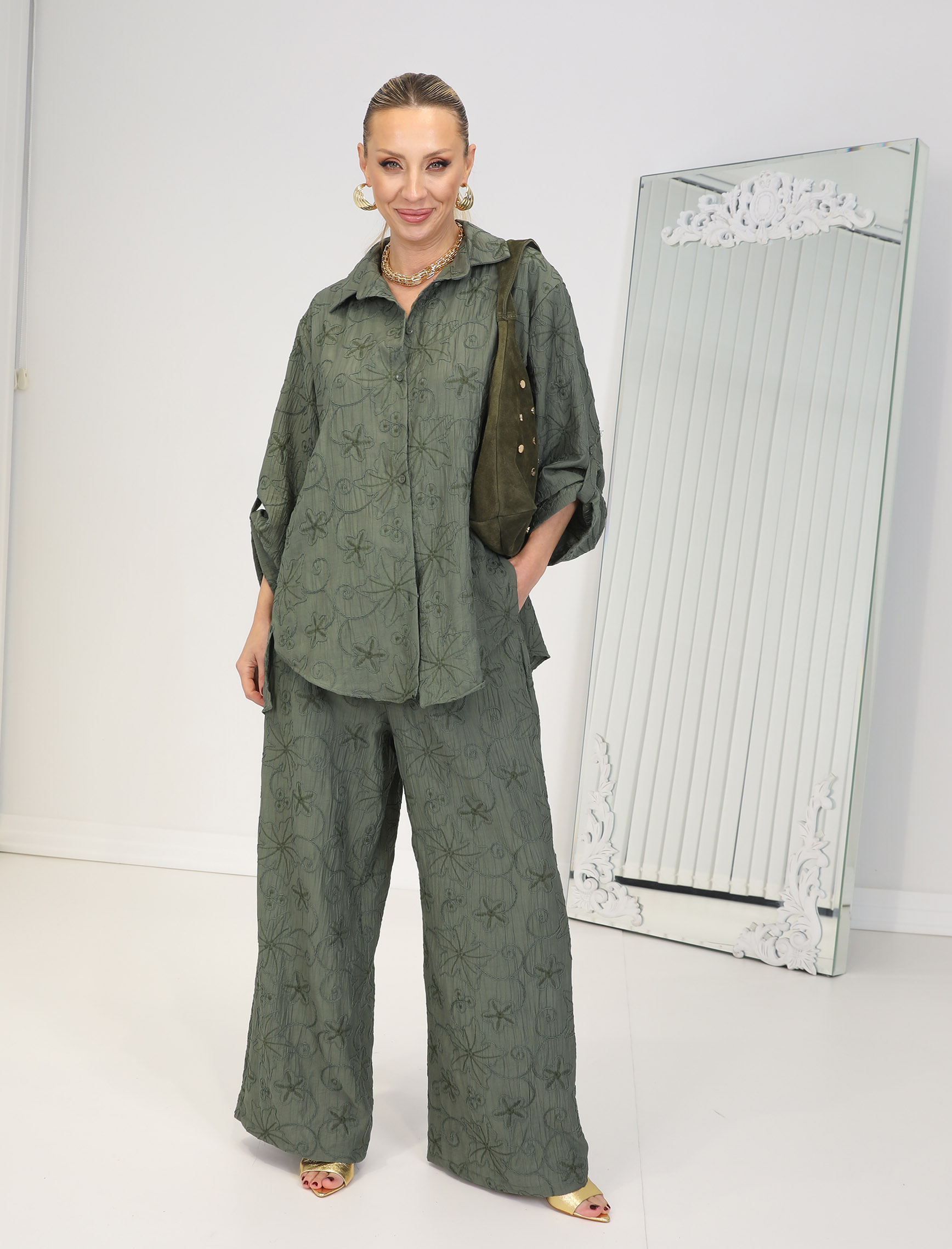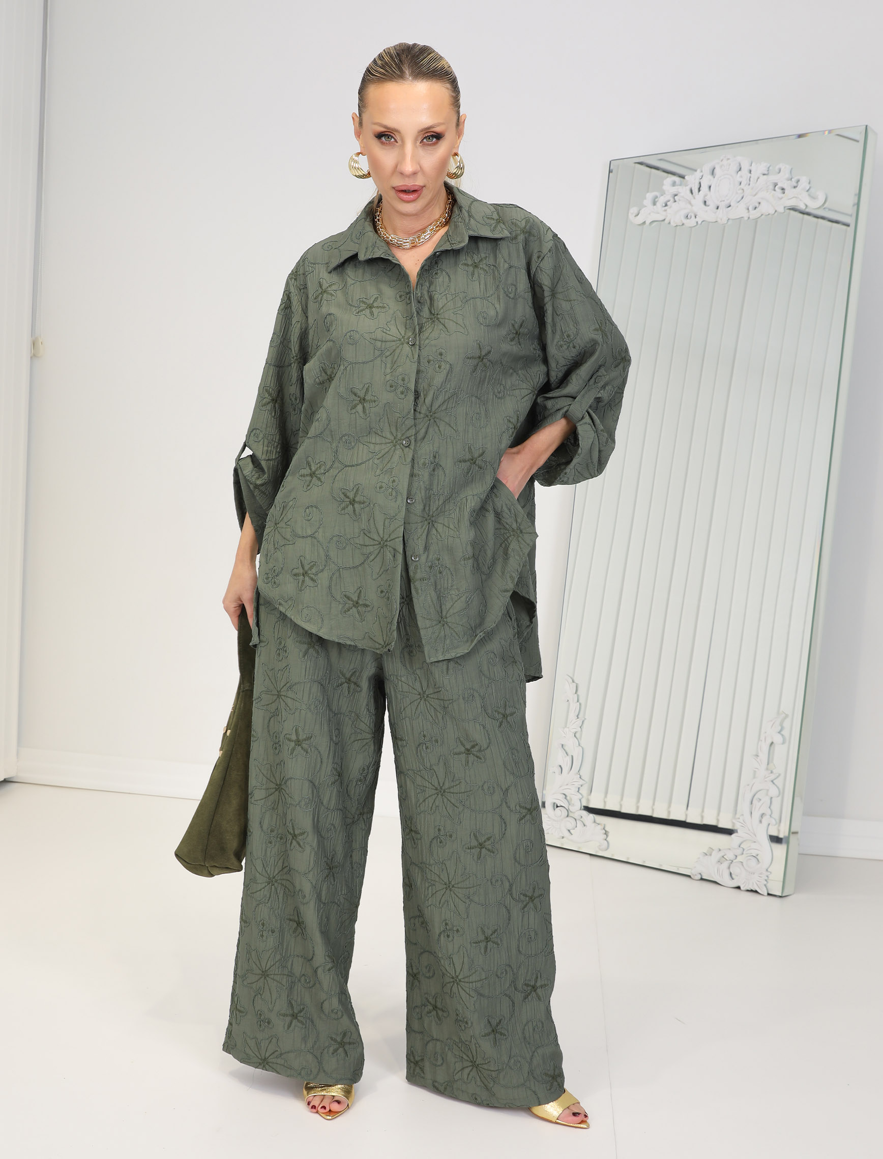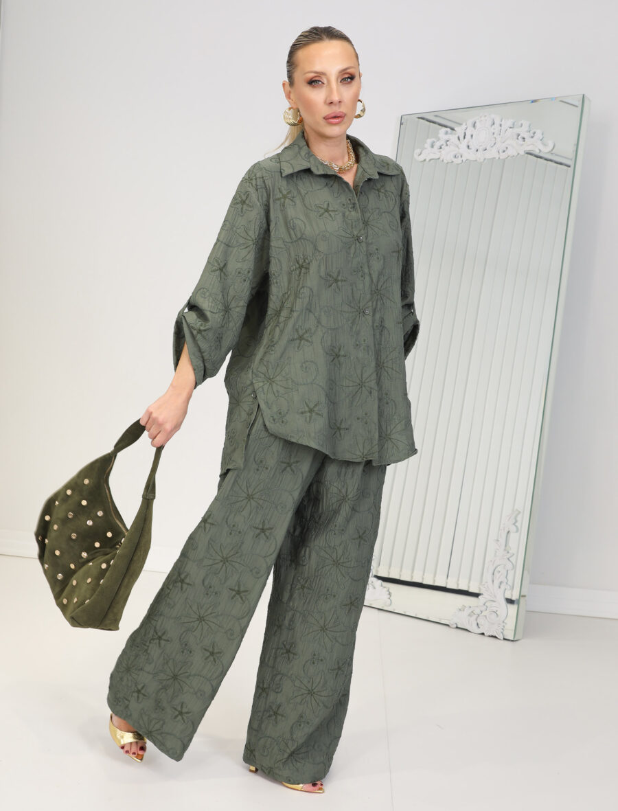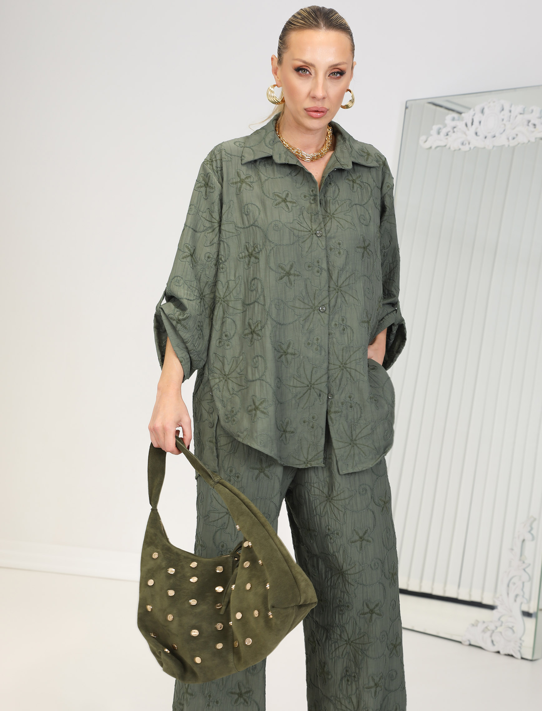Haki Nakışlı Floral Takım
