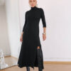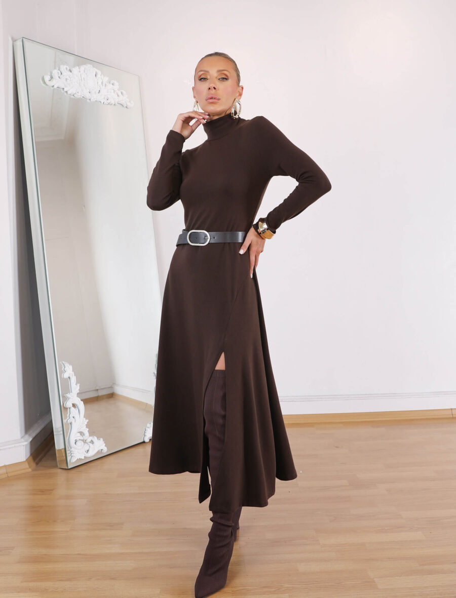 Kahve Boğazlı Yan Yırtmaç Elbise