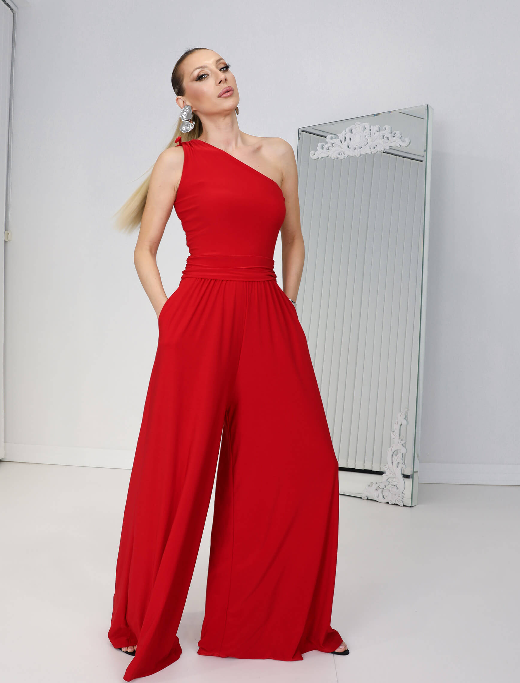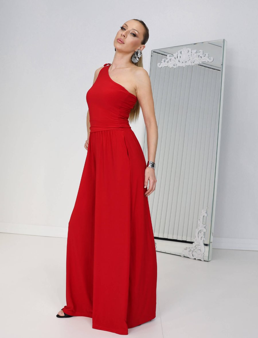 • Kırmızı Tek Omuz Layalı Tulum