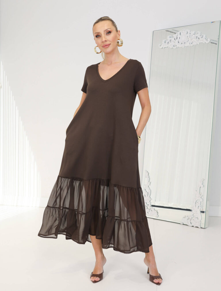 Kahverengi Eteği Şifon Nero Elbise