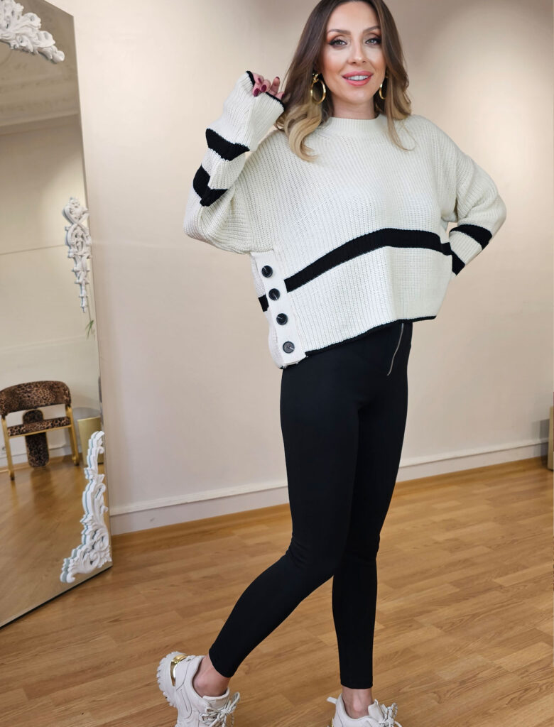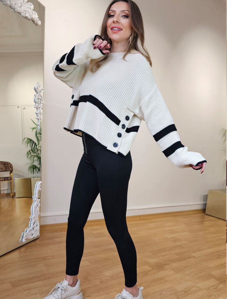 549,95 TL349,95 TL-36% İNDİRİM Bu ürünün birden fazla varyasyonu var. Seçenekler ürün sayfasından seçilebilirYan Düğme Ekru Siyah Çizgi Triko – OUTLET