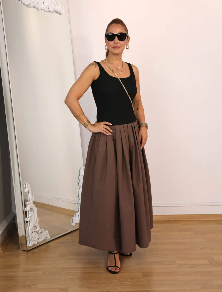 649,95 TL399,95 TL-38% İNDİRİM Bu ürünün birden fazla varyasyonu var. Seçenekler ürün sayfasından seçilebilirSiyah Kahve Poplin Pilise Etekli Elbise
