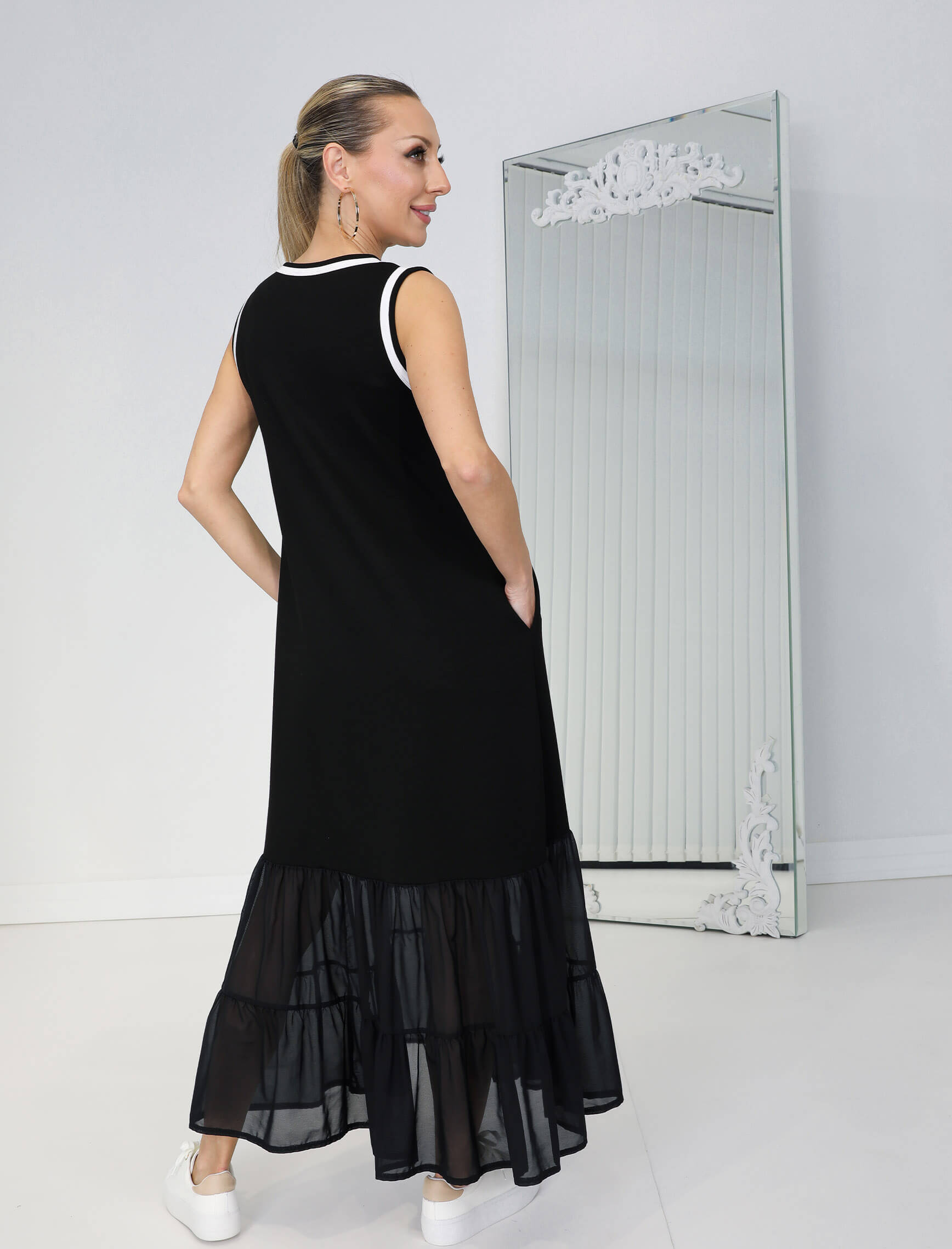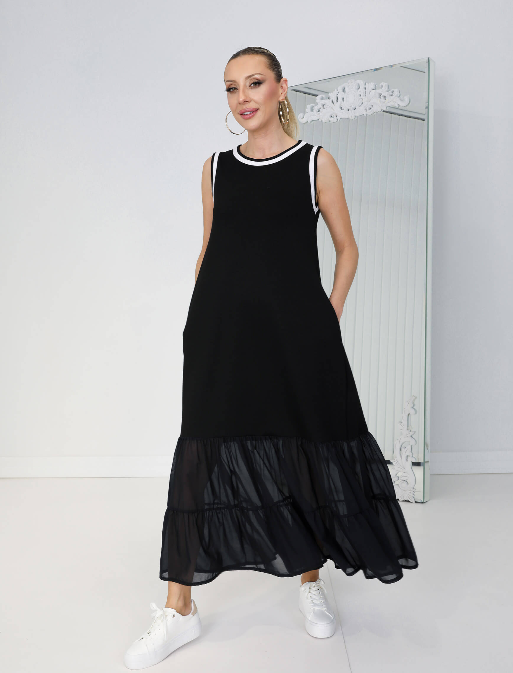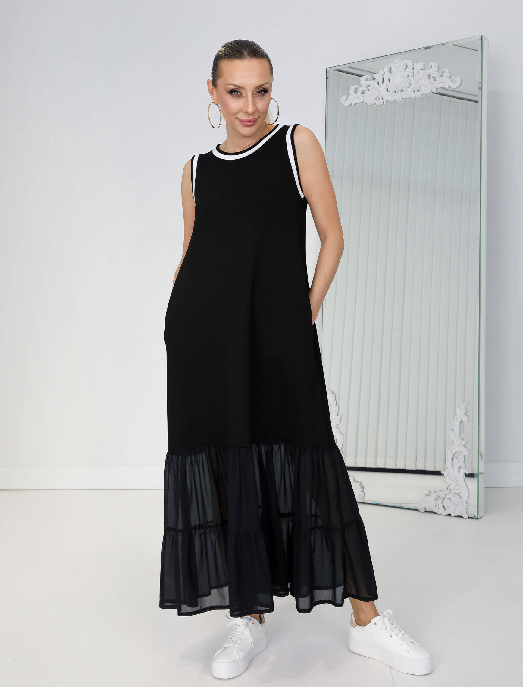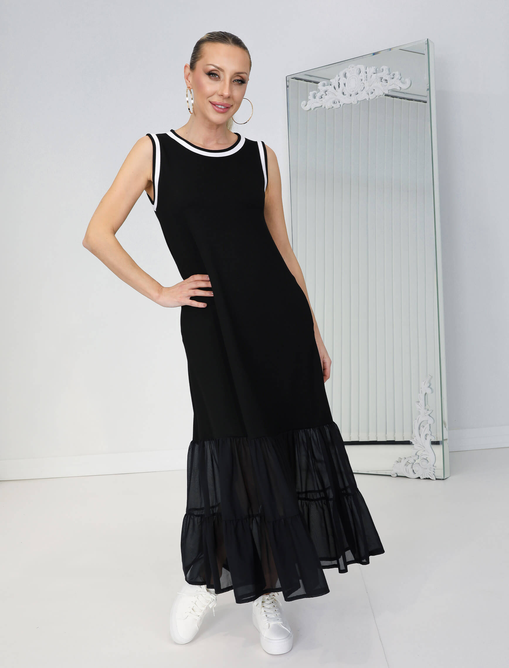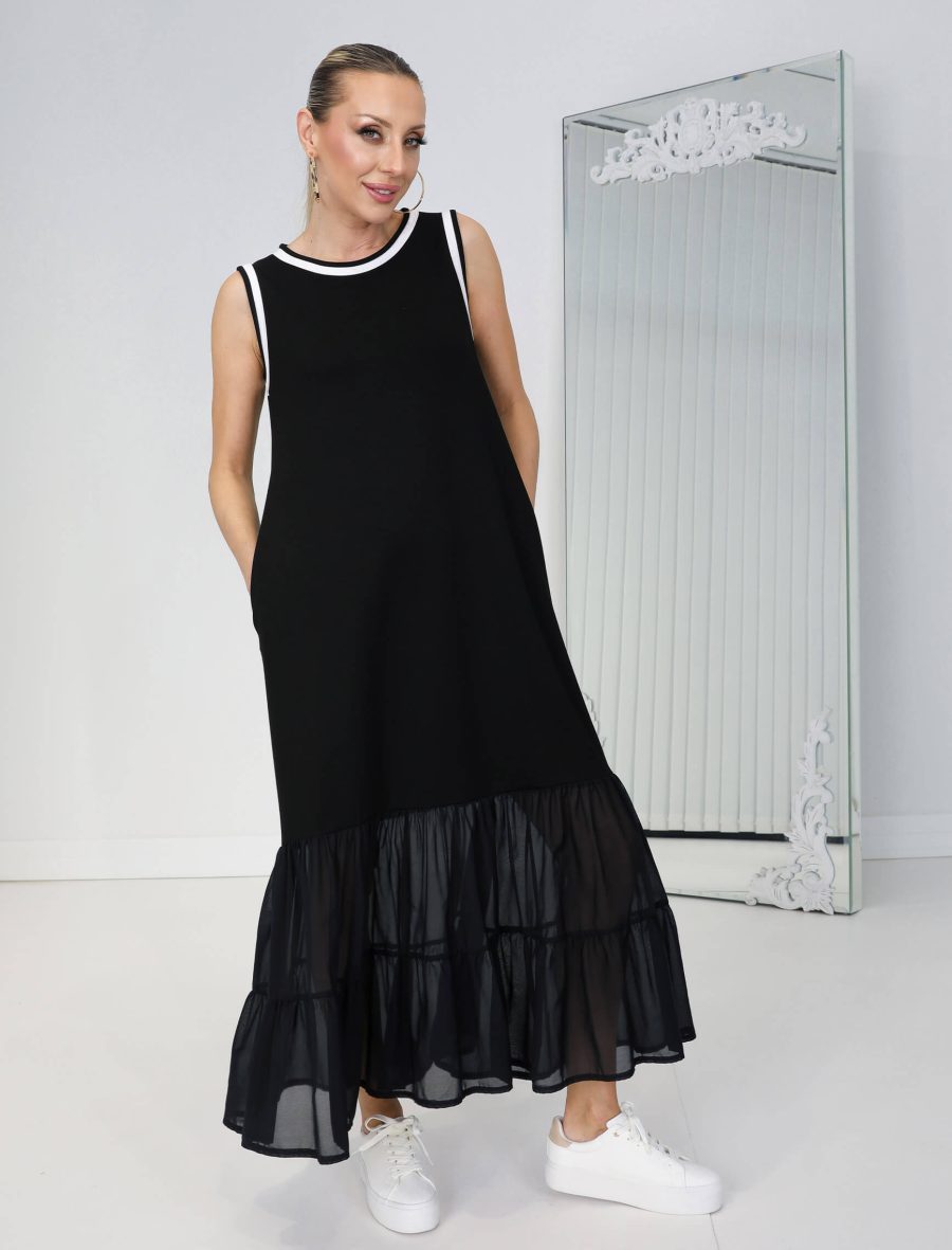 Siyah Beyaz Biye Şifon Etek Elbise