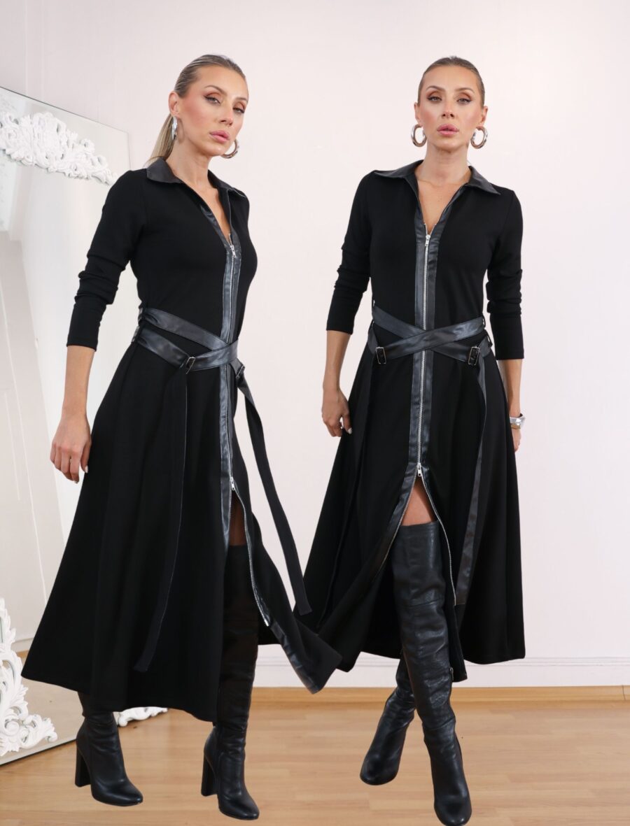 • Siyah Deri Detay Çapraz Kemer Elbise