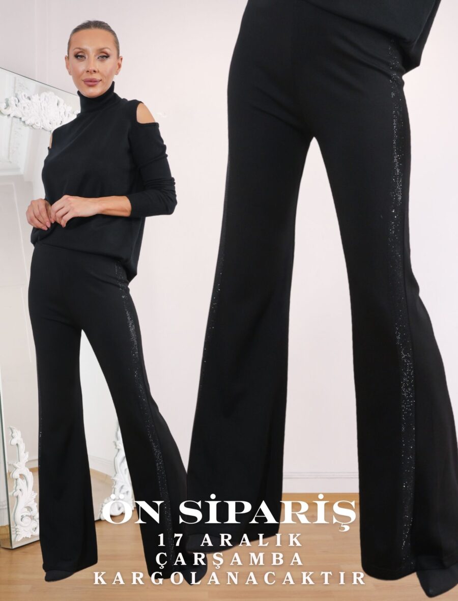Siyah Yan Siyah Taşlı Sparkle Strech Pantolon