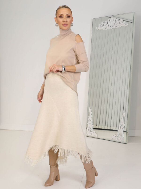 • Bej Asimetrik Saçaklı Triko Etek