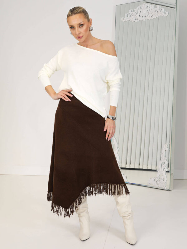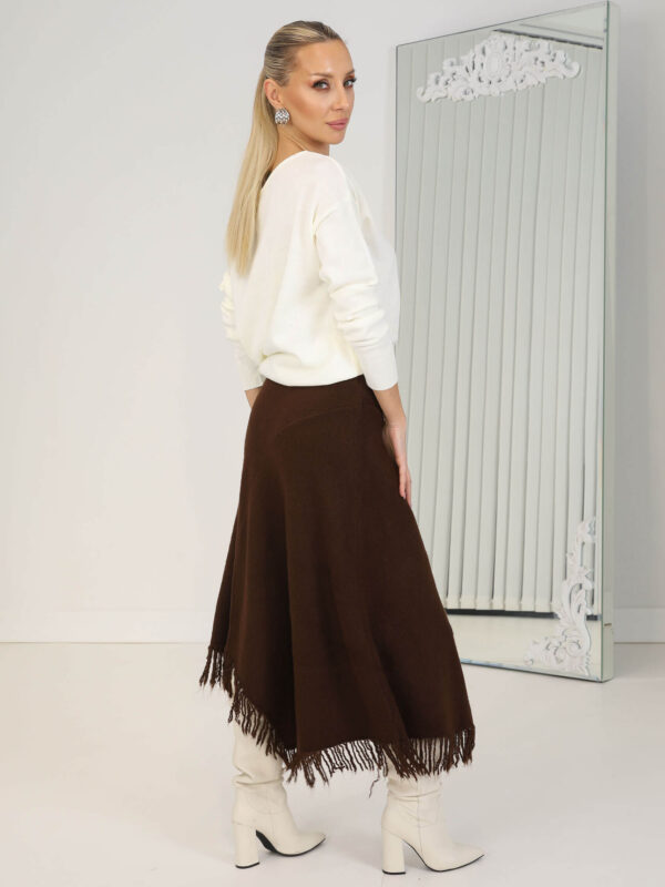 • Kahverengi Asimetrik Saçaklı Triko Etek